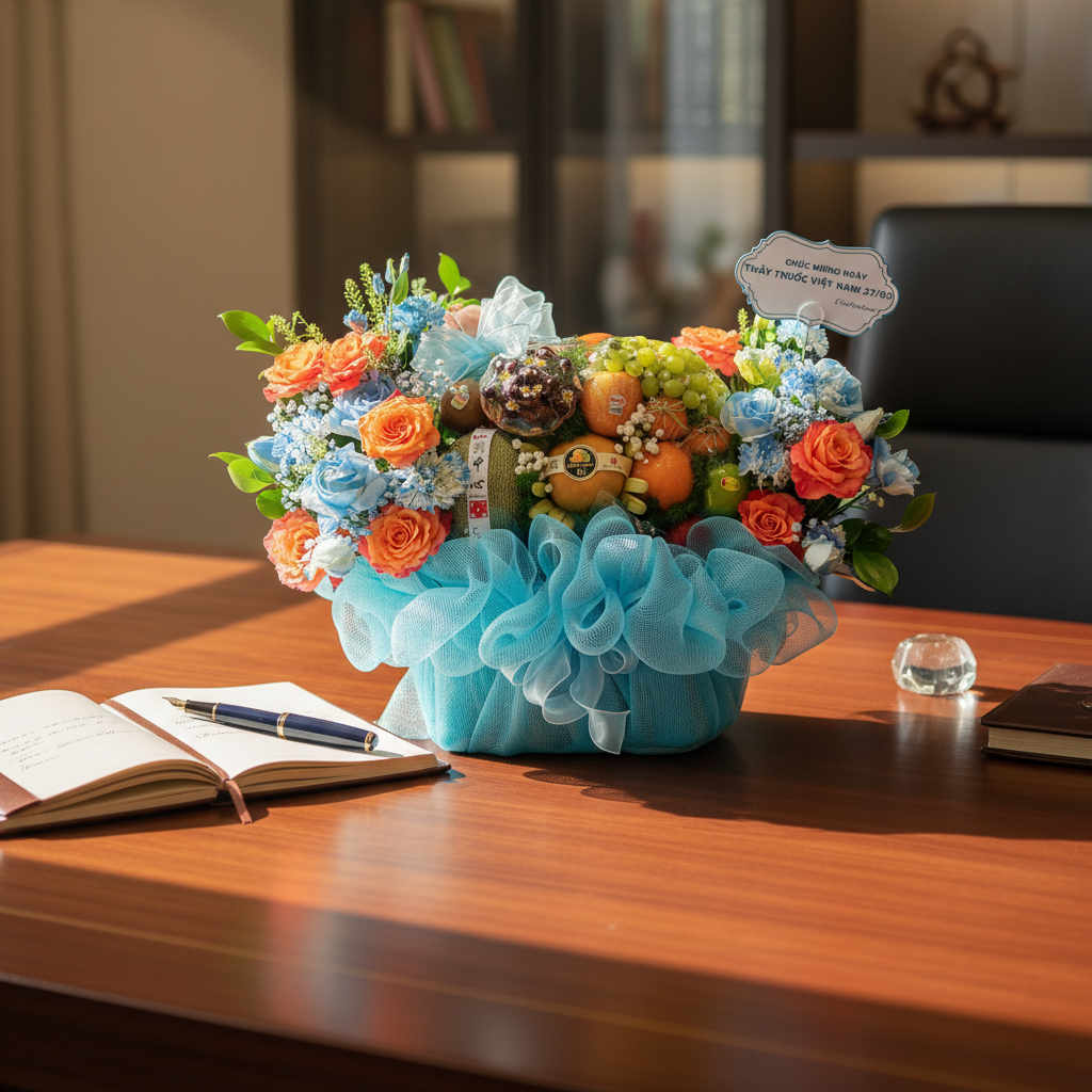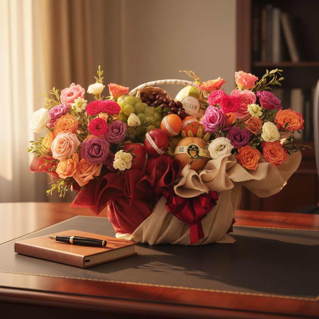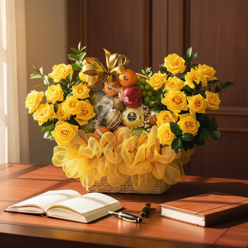 Tông màu quyền quý, trái cây nhập khẩu cao cấp, cách bày trí chỉn chu giúp món quà thể hiện sự tôn trọng, tri ân và đẳng cấp của người tặng.